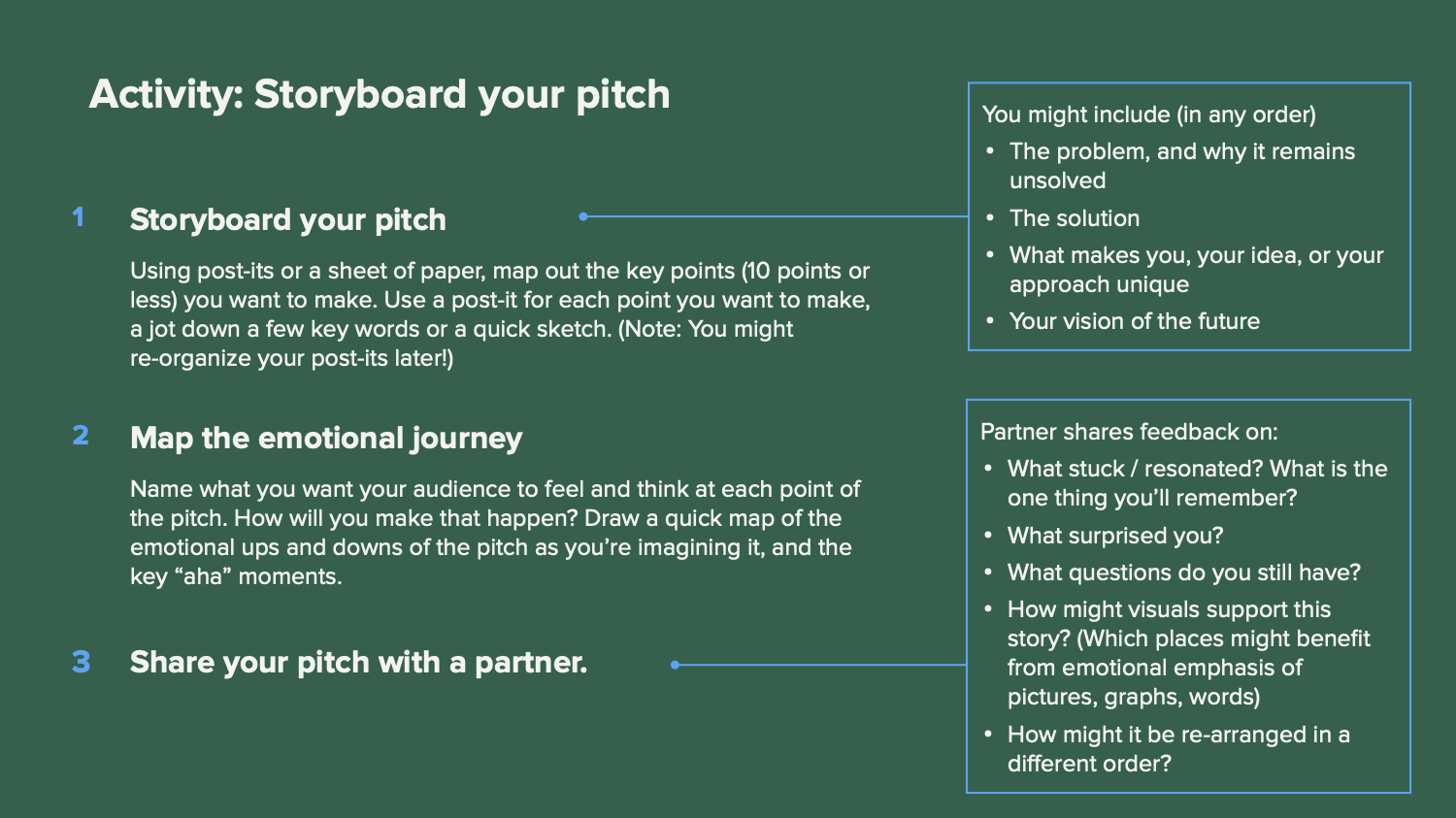 Create a first draft of your pitch by building a storyboard. Too often, when we make presentations we dive deep into crafting slides before really thinking about the story we want to tell. By starting with a story, you’ll get to the core of what you want to communicate, and make sure that your message resonates emotionally with your audience.