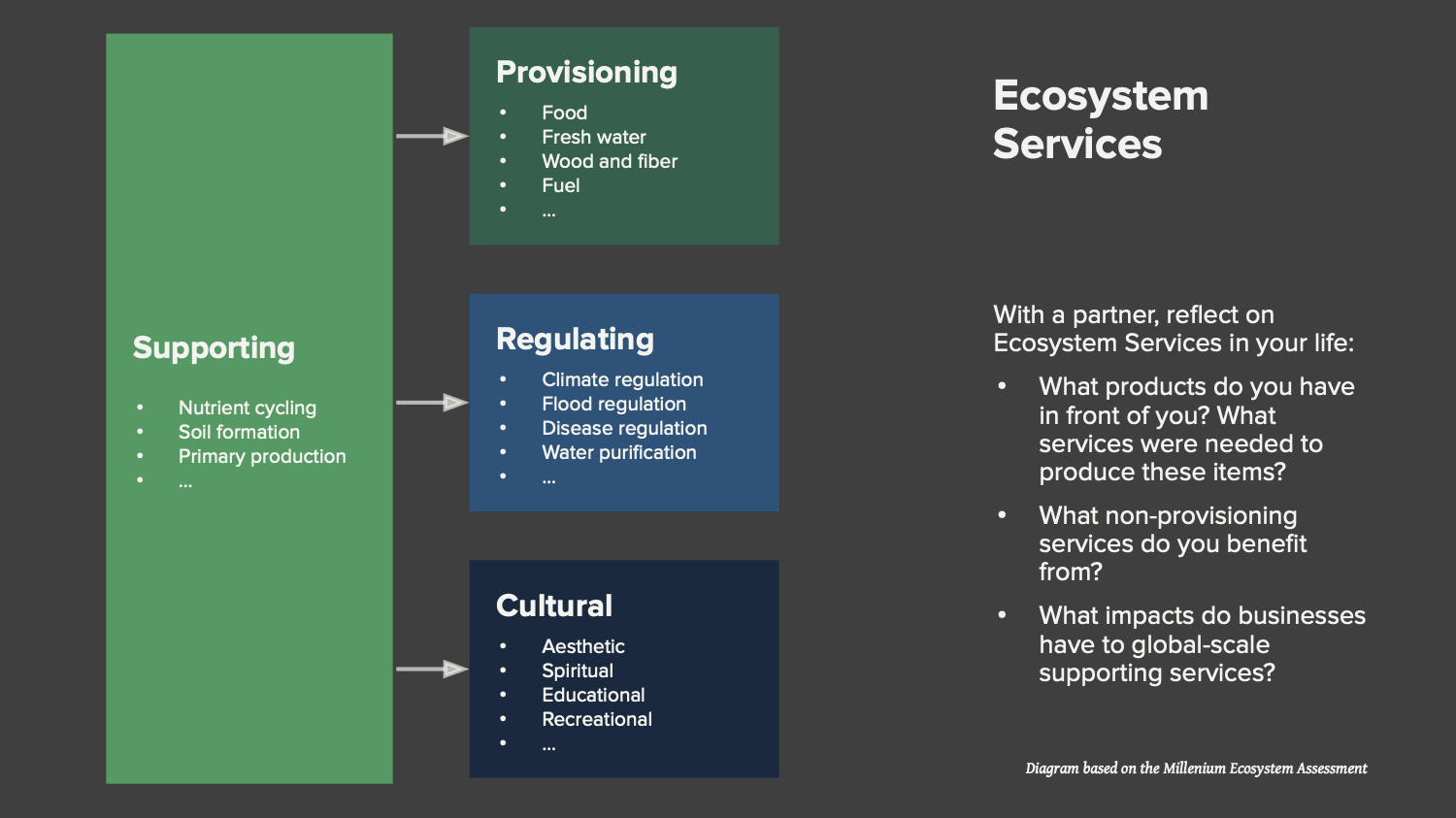 Ecosystem services is a concept widely used by decision makers to better understand environmental impacts. We’ll use it to contextualize our discussion around the impacts of business.