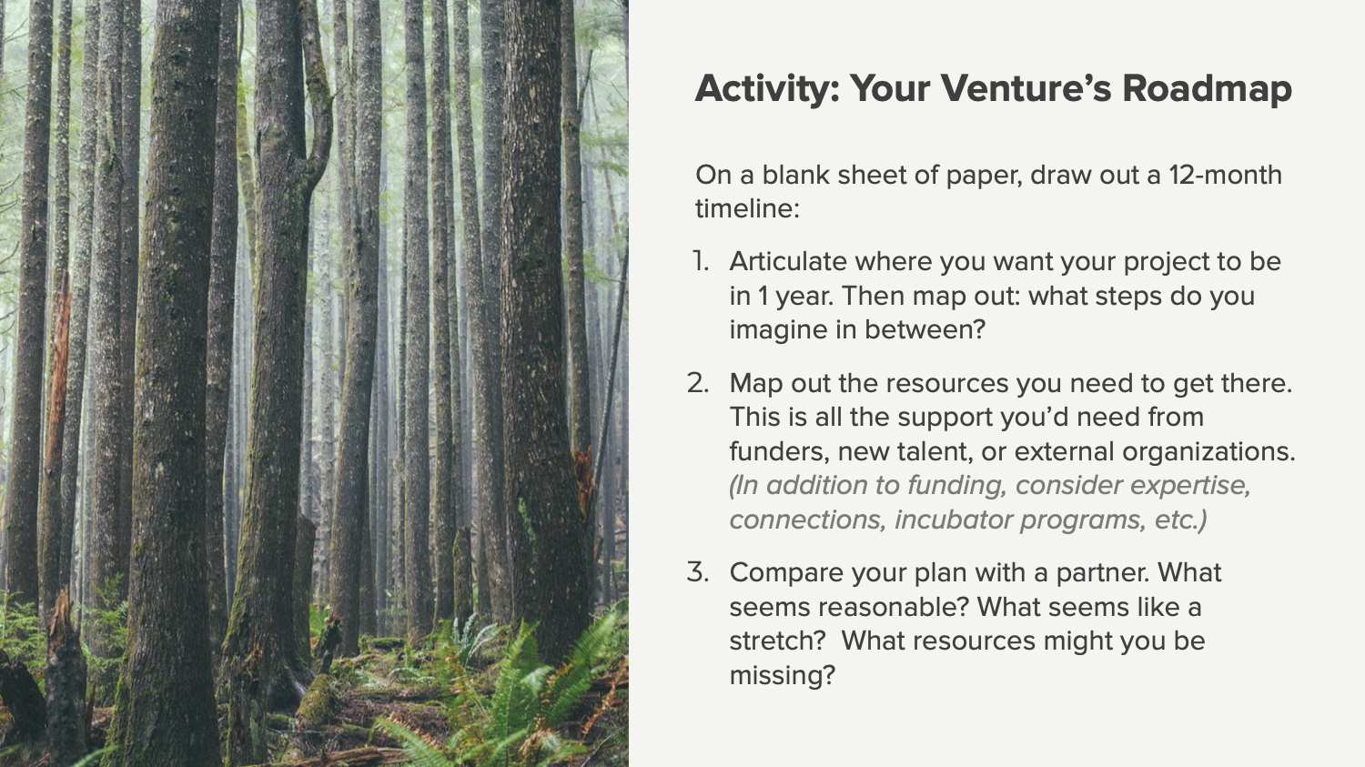 Visualizing your venture’s one year outlook will help you articulate what your goals are, what resources you might need to achieve these, and potential speed bumps.