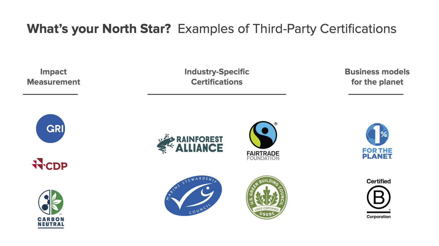 These widely-used standards serve as a reference for how industries are currently thinking about monitoring and managing business’ environmental impact. While many of these are criticized for not going far enough to actually solve the problems at hand, they’re a great way to get started and understand how businesses currently think about environmental performance.