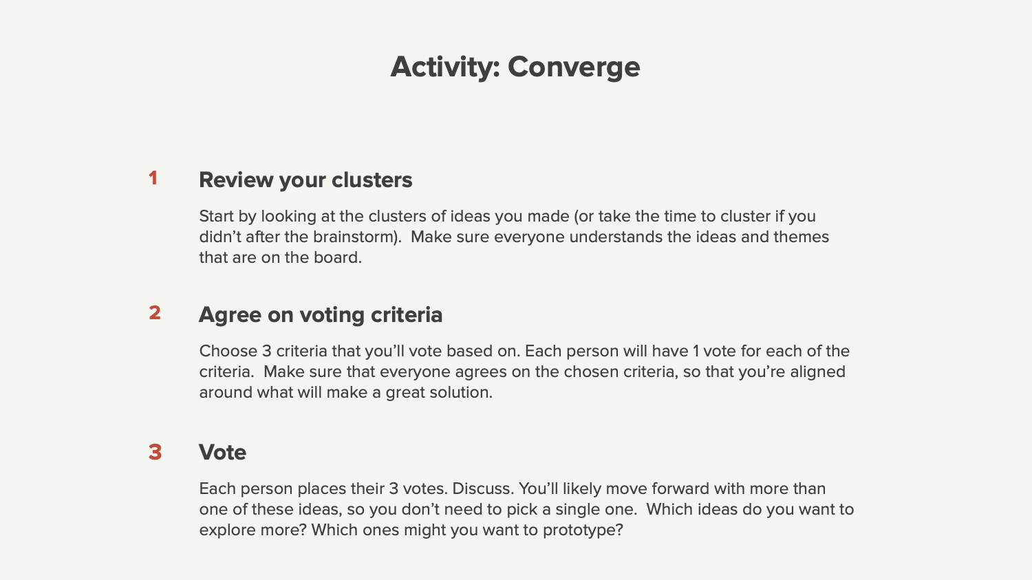 As a team, agree on voting criteria and select the ideas that you’ll move forward with.
