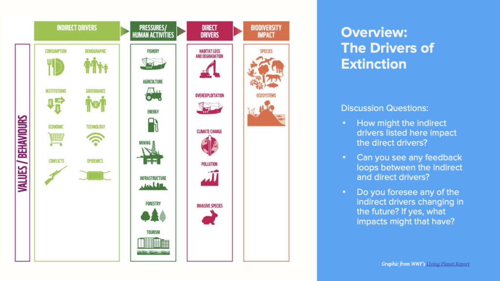 This introductory content sets the stage for why the problems we face are so urgent, and why it’s not an option to use only the tools and approaches that have been traditionally used in environmental conservation. An overview of the drivers of environmental problems will give you a sense of the different problems and opportunities you might engage in, and set you up to select a topic to work on.