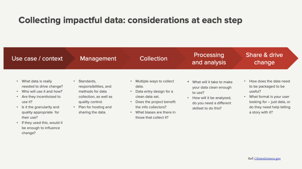 Here, we share some key considerations in collecting data to ensure that the output is useful for the intended purpose, and that it actually gets used to drive change.